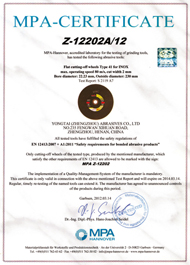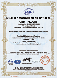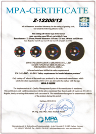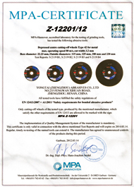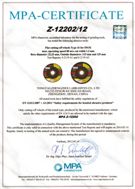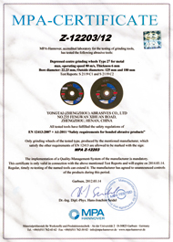 In 2000, Yongtai Abrasive passed ISO9000 Quality Management System certified by the International Organization for Standardization. Our products were tested and certified by Germany MPA Hannover for safety from 2003. We fulfilled the requirement of "EN 12413 Safety requirement for bonded abrasive products" set by the European Safety Standard from 2005.
